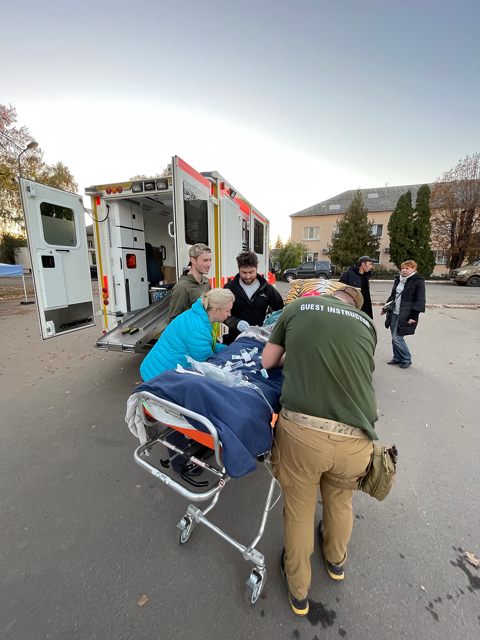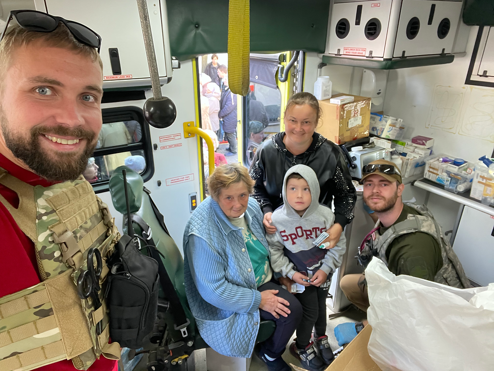 On the way back, we had two evacuations—a family of 5 people with an 87-year-old grandmother who could not walk and a paralyzed lady lying down after a stroke. The road was very hard for her, so the medical team helped her cope with the road and motion sickness easier with the help of medicines. We took everybody to Kharkiv.